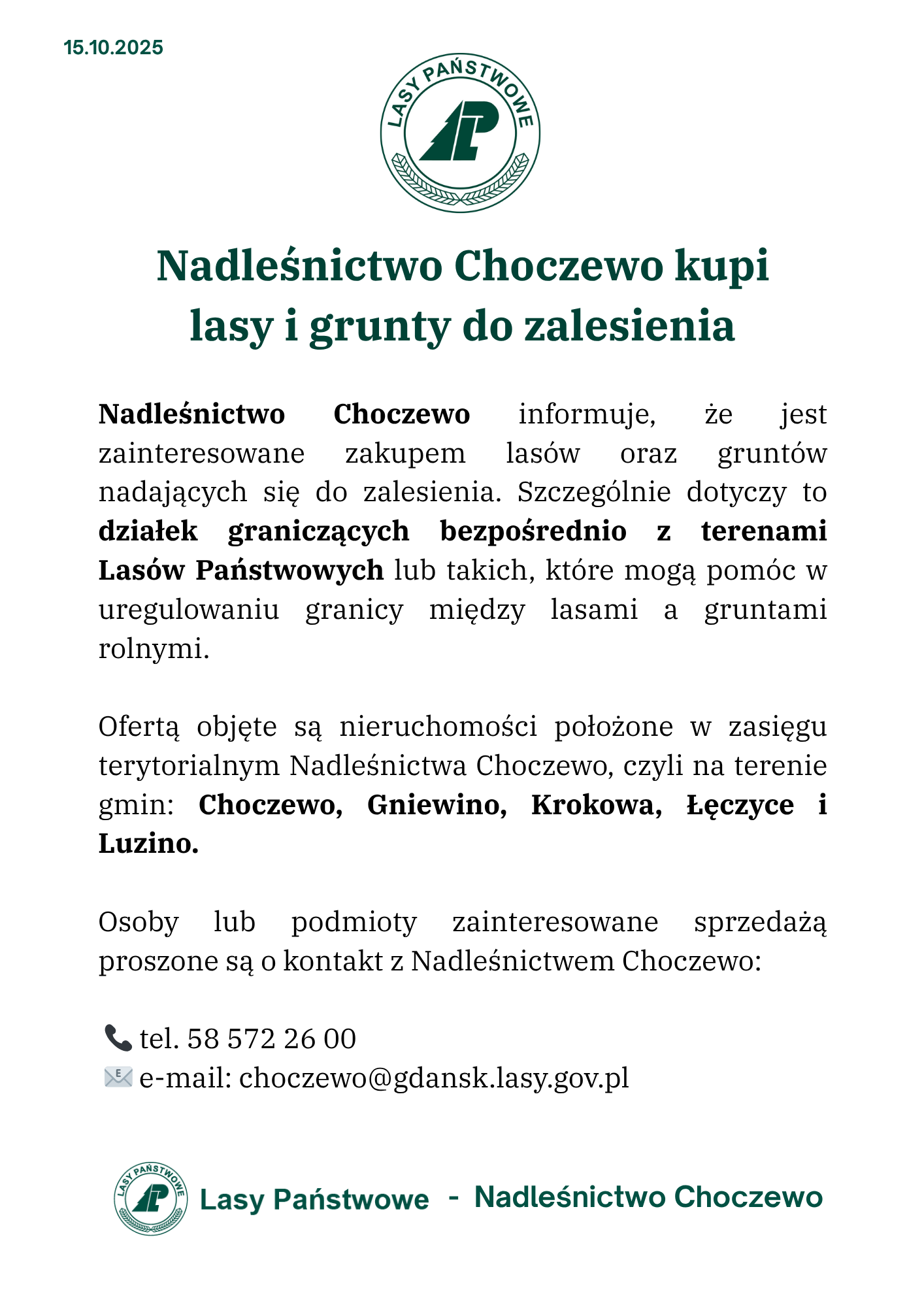 Ogłoszenie o możliwości zakupu lasów i gruntów przeznaczonych do zalesienia